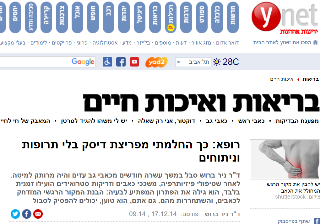 רופא: כך החלמתי מפריצת דיסק בלי תרופות וניתוחים. ד"ר ניר ברוש סבל במשך עשרה חודשים מכאבי גב עזים והיה מרותק למיטה. לאחר שטיפולי פיזיותרפיה, משככי כאבים וזריקות סטרואידים הועילו זמנית בלבד, הוא גילה את הפתרון המפתיע לבעיה: הבנת המקור הרגשי המודחק לכאבים, והשתחררות מהם. גם אתם, הוא טוען, יכולים להפסיק לסבול ד"ר ניר ברוש. פורסם: 17.12.14
